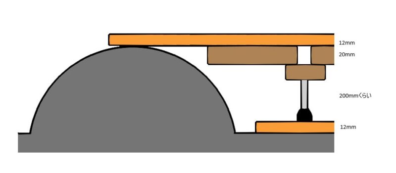 嵩上げの高さは、タイヤの上でパネコートを支えられるくらいが目安です。床束で支える部分は、 化粧カバーの収納スペース になるため、最低でも 200mm程度の高さ は確保しておきたいところです。パネコートの下には パーチクルボードを挟んで、補強と水平出し を行うイメージです。床の凹凸をそのまま無視すると、どうしてもガタつきが出るので、この層で微調整しながら全体を安定させていきます。(こんな感じです↓)